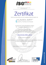 Die Human Art GmbH hat im Jahr 2007 ein Qualitätsmanagement aufgebaut und eingeführt. Im Juli 2007 folgte dann die Zertifizierung gemäß DIN EN ISO 9001:2000. Seitdem stellen wir uns jährlich unseren strengen Qualitätsvorgaben und lassen diese intern und extern überprüfen. Die Norm wurde in der Zwischenzeit zur ISO 9001:2008 erneuert und wir sind diesen Prozess mitgegangen. In diesem und dem kommenden Jahr steht eine erneute Revision zur ISO 9001:2015 an, diesen Weg wollen wir auch weiterhin verfolgen.